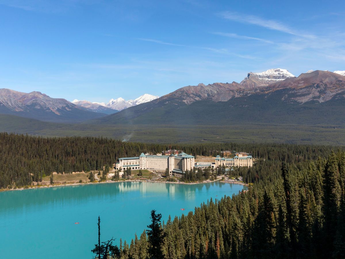 Fairmont Chateau Lake Louise at one end of the lake | Credit: Rocky Mountaineer