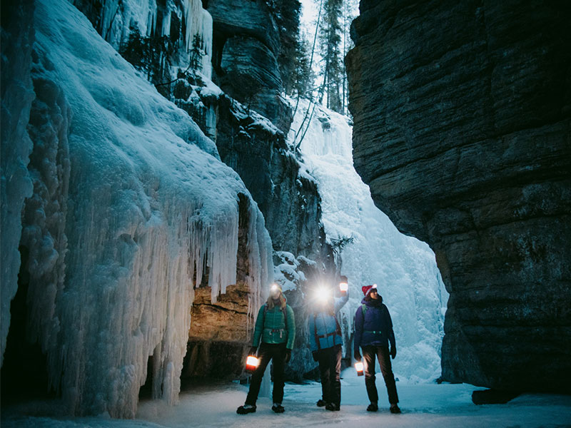 Hiking is replaced with snowshoeing or ice walks, and there are endless trails for both! Jasper's Maligne Canyon is the deepest in all of Jasper National Park, and while it's full of rushing water in the summer months it freezes over entirely in winter. Join a guided Ice Walk and walk directly along the canyon's frozen floor, or try your hand at ice climbing up frozen waterfalls for an experience like no other.