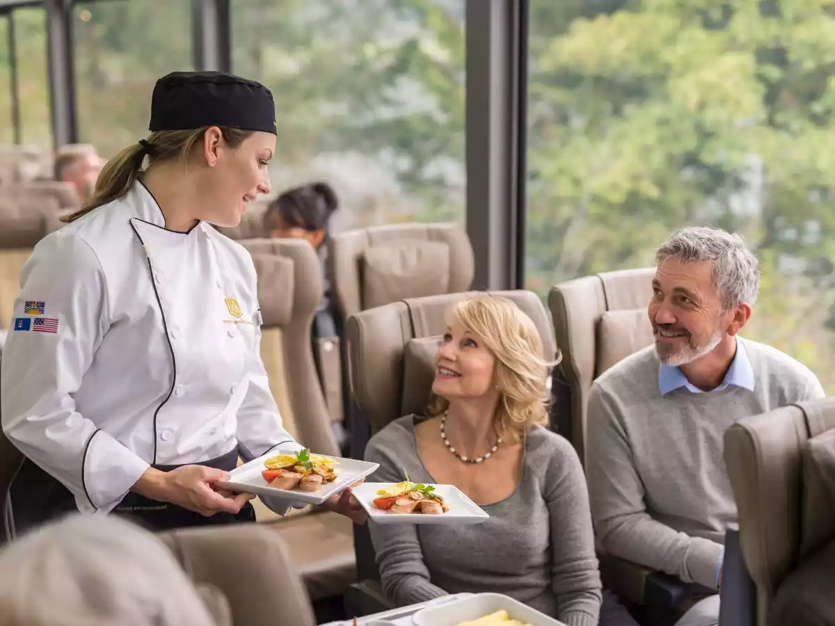 Regionally inspired cuisine takes center stage in the form of multi-course meals, produced from locally sourced ingredients and prepared by onboard chefs. And if you find yourself hungry, your Hosts are always ready with snacks and drinks — you are sure to be kept full and comfortable during your time on the train.
