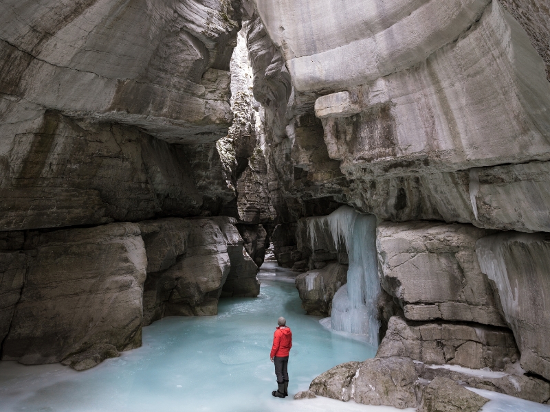 Embark on a journey from Vancouver, where the city’s mild winter gives way to the awe-inspiring, snow-draped peaks of the Canadian Rockies. As you leave behind the urban bustle, the train winds its way through the serene Fraser Valley and into the heart of the Rockies, where winter’s magic truly comes alive. Step off the train in Jasper for an abundance of activities such as an ice walk through the stunning Maligne Canyon, where frozen waterfalls and ice formations create a breathtaking winter wonderland.