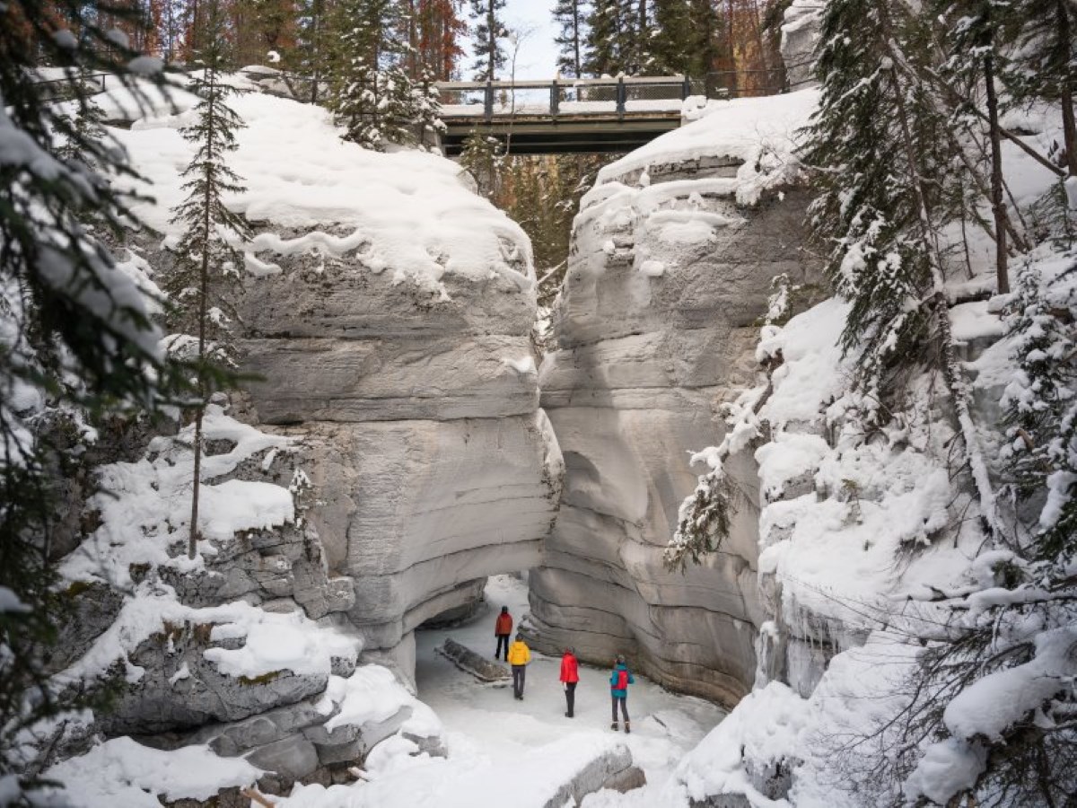 Jasper is best experienced, however, through its access to nature. The most immersive, perhaps, is the Ice Walk at Maligne Canyon. In summer, water gushes through the narrow gorge and is visible through walkways and bridges above. But, come winter, the water freezes and you can descend into the canyon to be entirely surrounded by snow and ice.